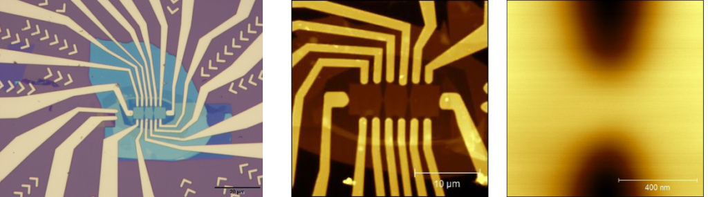 Advices on etching physical constrictions: The constrictions are physically created by etching the sample and have a typical width around 300 nm. This step requires particular care due to the risk of completely closing the constriction and rendering the sample unusable. The only way to avoid this is by testing your lithography and etching parameters directly in a BN layer. Having a well calibrated BN etch rate is also very important. Here is an example of the physical constrictions created by the consortium in twisted bilayer graphene.