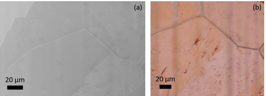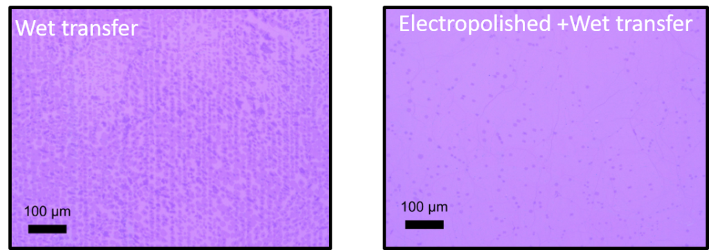 (Left), Optical microscopy image of a graphene sheet synthesized on an electropolished copper foil piece and wet-transferred onto a SiO2/Si substrate. (Right) The same graphene sheet grown in an area left unpolished of the copper foil piece.