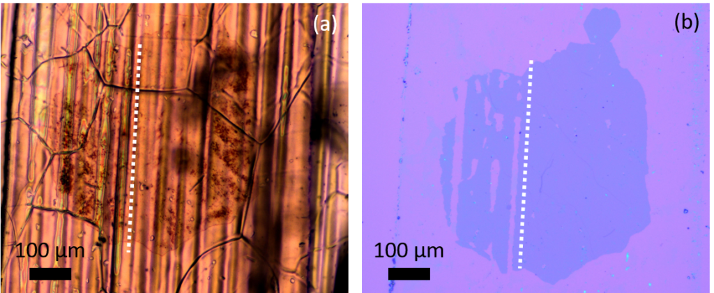 (a) Optical microscopy image of an isolated single-layer graphene flake on copper after contact with the polymer stamp (seen through the glass slide supporting the stamp). (b) Optical microscopy image of the same flake after dry exfoliation and transfer onto a 300-nm-thick SiO2/Si subtrate. The white dotted line is a guide to the eye.