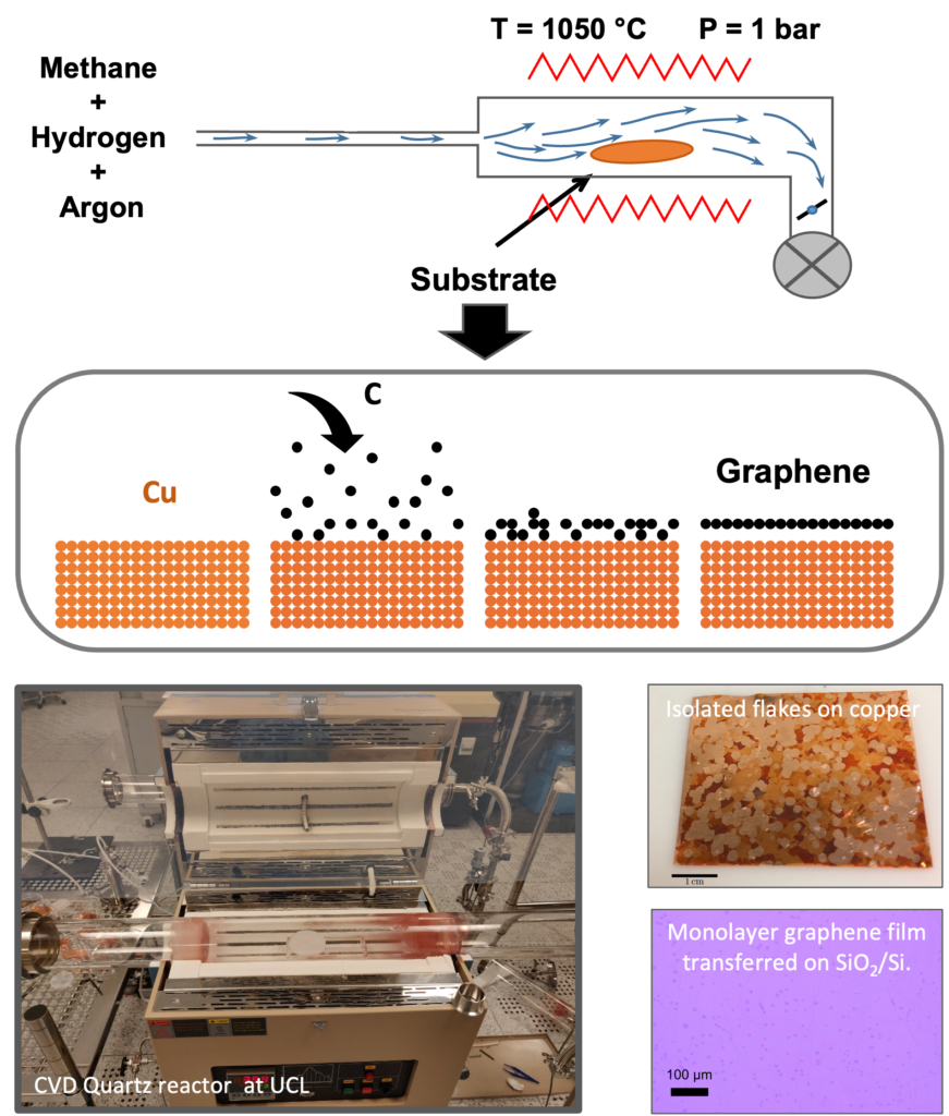 Quartz reactor pumped to primary vacuum and returned to atmospheric pressure with argon. Copper foil as catalyst. The furnace is heated to 1050°C. Once 1050°C has been reached in the tube, methane and hydrogen are introduced in addition to argon. After a growth time of one to several hours, the tube is slowly cooled down to room temperature.